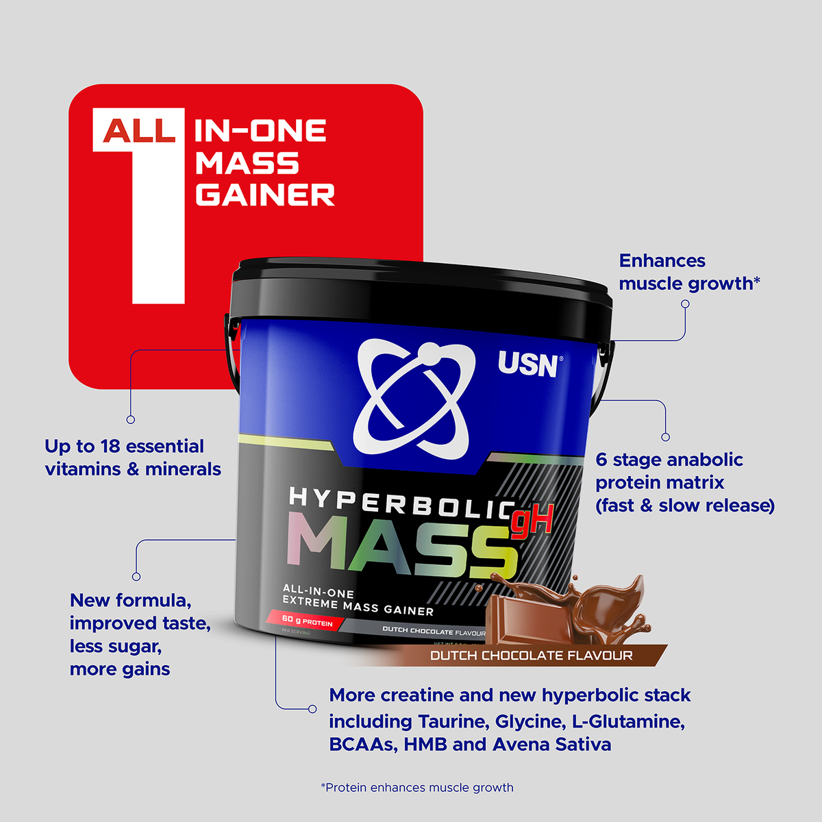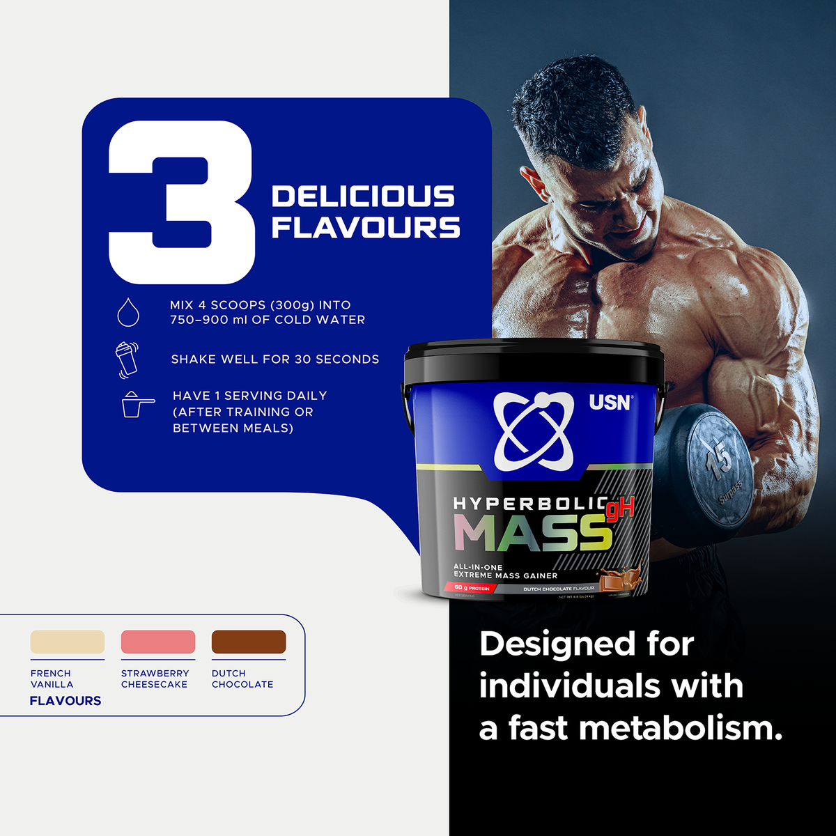 USN Hyperbolic mass has been scientifically formulated for individuals with a fast metabolism who demand a high level of energy from quality carbohydrates to help reduce the breakdown of muscle tissue for energy.